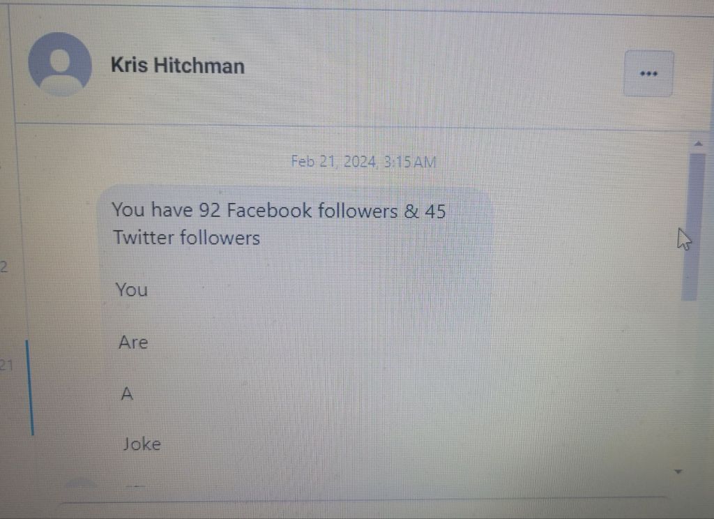 The group is the hater group. These are the people who directly or indirectly attack me and my content. These are the people who somehow find the time during their day to make up a fake account just to inbox me messages of hate. They ignore me, they’re in a private competition with me, the laugh at me, they fight with me, they copy my work after they say its shit, and they try to analyze me and figure me out just so they can dismiss me.