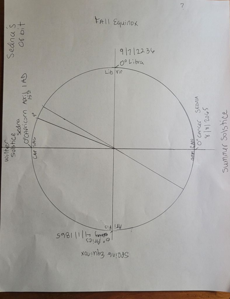 I decided to track planet Sedna around the zodiac wheel because I wanted to see how long she spent in each sign. I was both fascinated and intrigued, and at the time, I was still conducting my research on the basis that her orbital period was 11,400 years. As a really slow-moving planet, I was expecting to see something crazy like almost 1,000 years per sign.