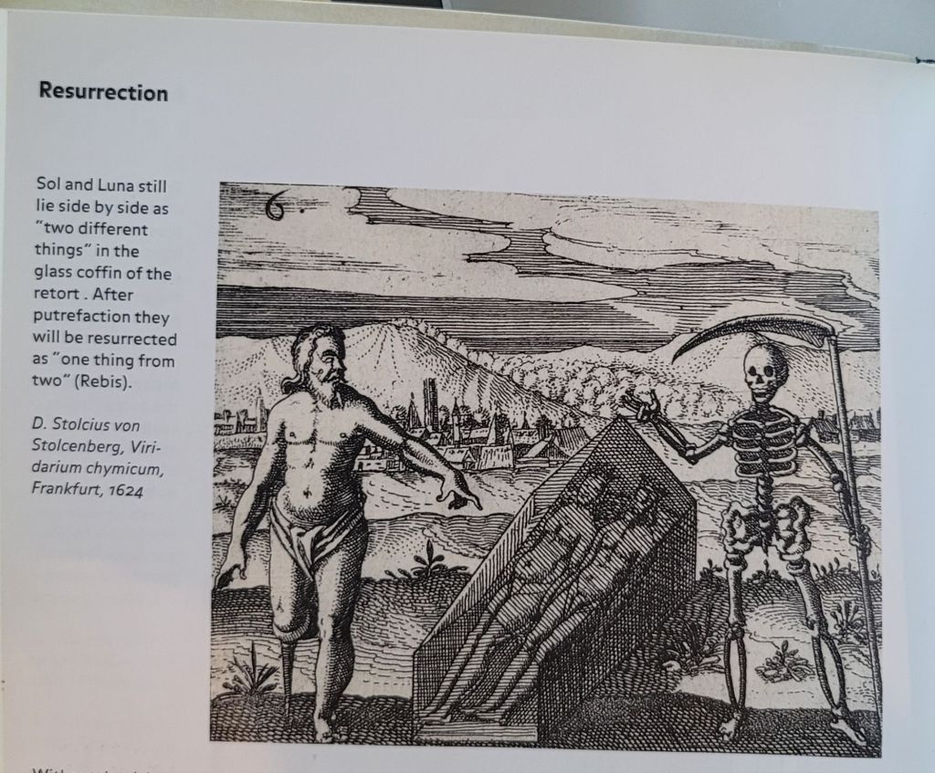 Notice, in the top left-hand corner of the picture above, it says resurrection. Under resurrection, it says, sol and luna still lie side by side as two different things, but after putrefaction (rotting/decay), they will be resurrected as one thing from two.