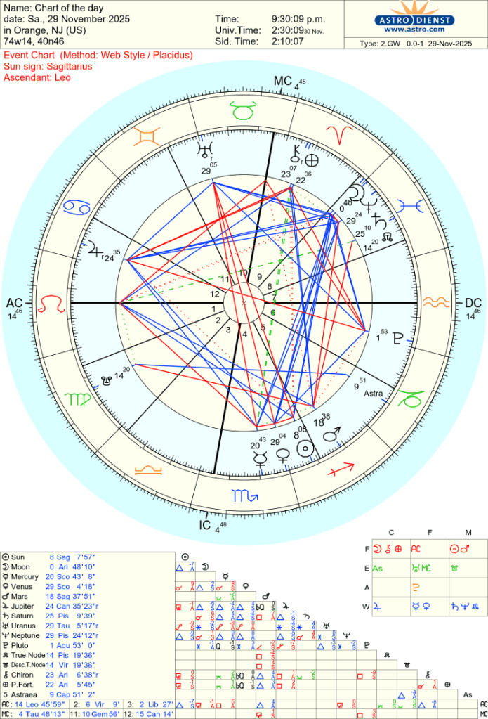 If you take a peek at the astrology chart provided by Astro.com, you’ll see the Moon in the Eleventh House on the 2nd degree of Sagittarius. The Sun is only four degrees away in Scorpio on the 28th degree, which means the Sun and the Moon are conjoined with four degrees of separation. As far as this conjunction is concerned, four degrees of separation is still close enough for these two luminaries to be influenced by one another.