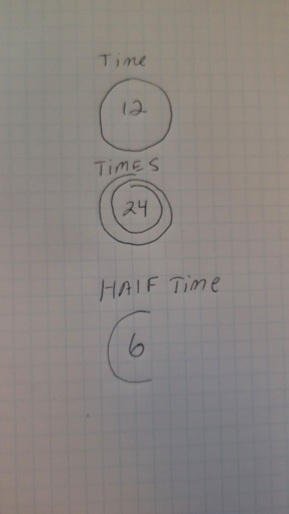 Now, my wheels were spinning! And, I started to think some more, and all these thoughts flashed in my mind. Once I knew the time was 12, and times was 24, and a half time was 6..