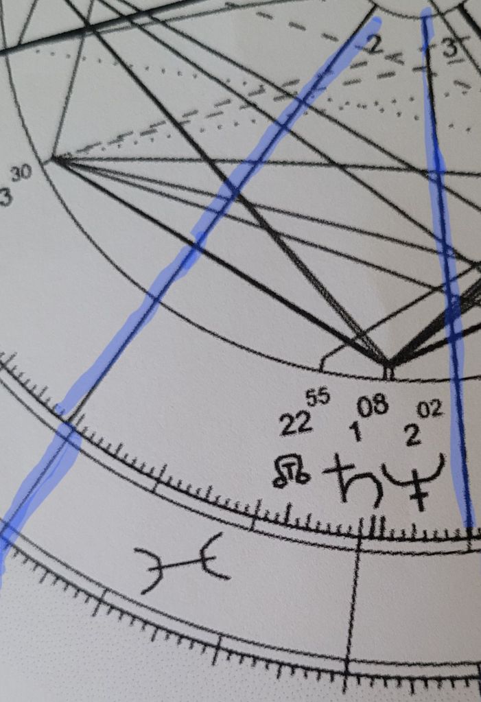 Saturn and Neptune were in the Second House in Aries on the 1st and 2nd degrees, and off in the distance almost ten degrees away was the moon’s north node in Pisces on the 22nd degree.
