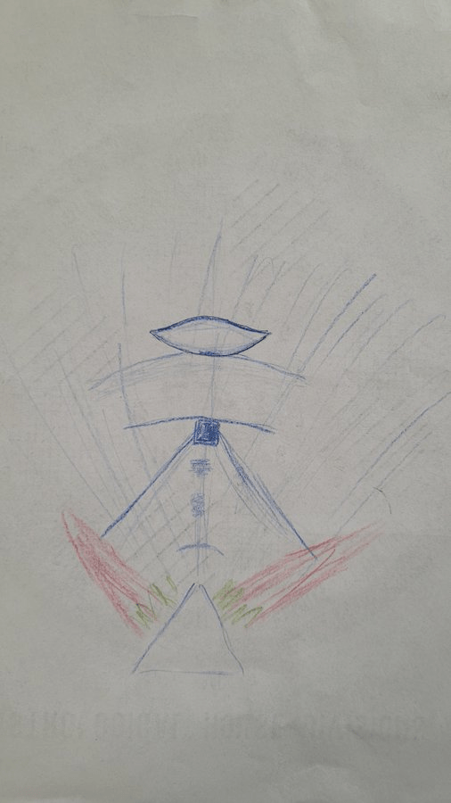 The triangle was now the v-neck, and the chequered curtains formed the top of the wings that were extended by the red rays of sunshine. The Sun is the head, and if you look closely, you can see two arms in blue resting at the waist area.