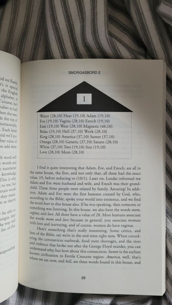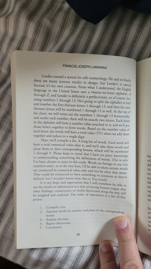 The back story is this; I created a system of numerology called “Oculus 13” and when I began using this system on my own time to find the number value of certain words, I realized that certain words beginning to connect not only by the value they shared, but also by their association to one another as they were used in mythology, astrology, biblical narratives, etc. That was my motivation for writing Alien Interpretation, and I created the story to fit around my findings. The first three pages of that chapter are below.